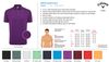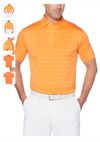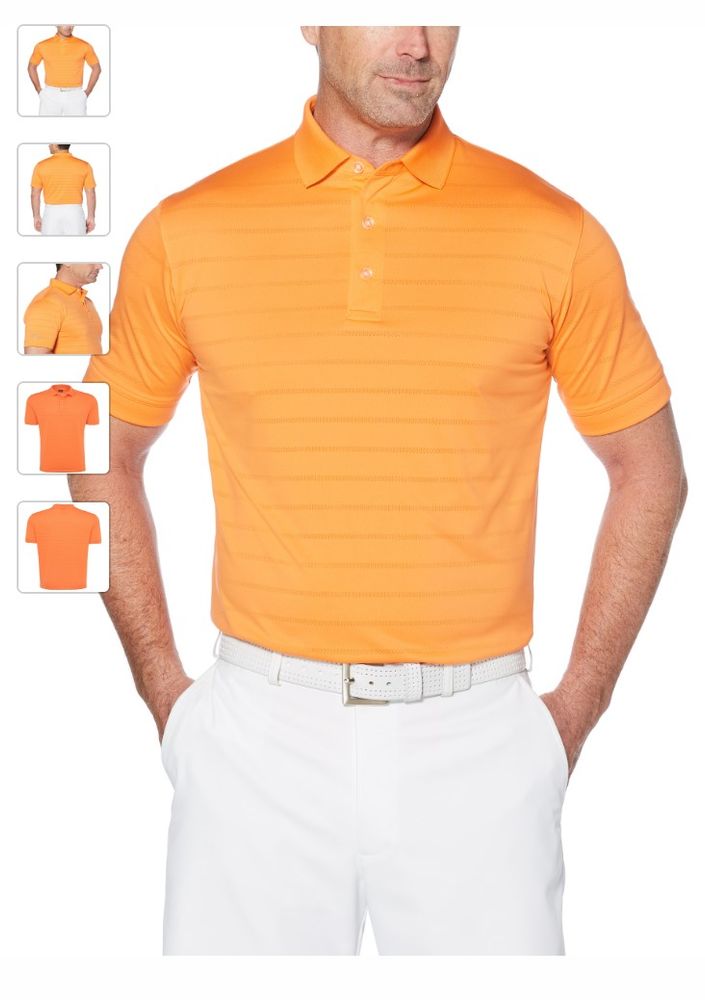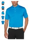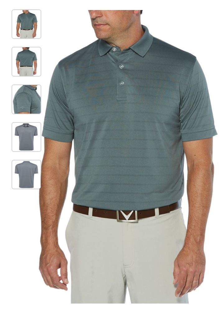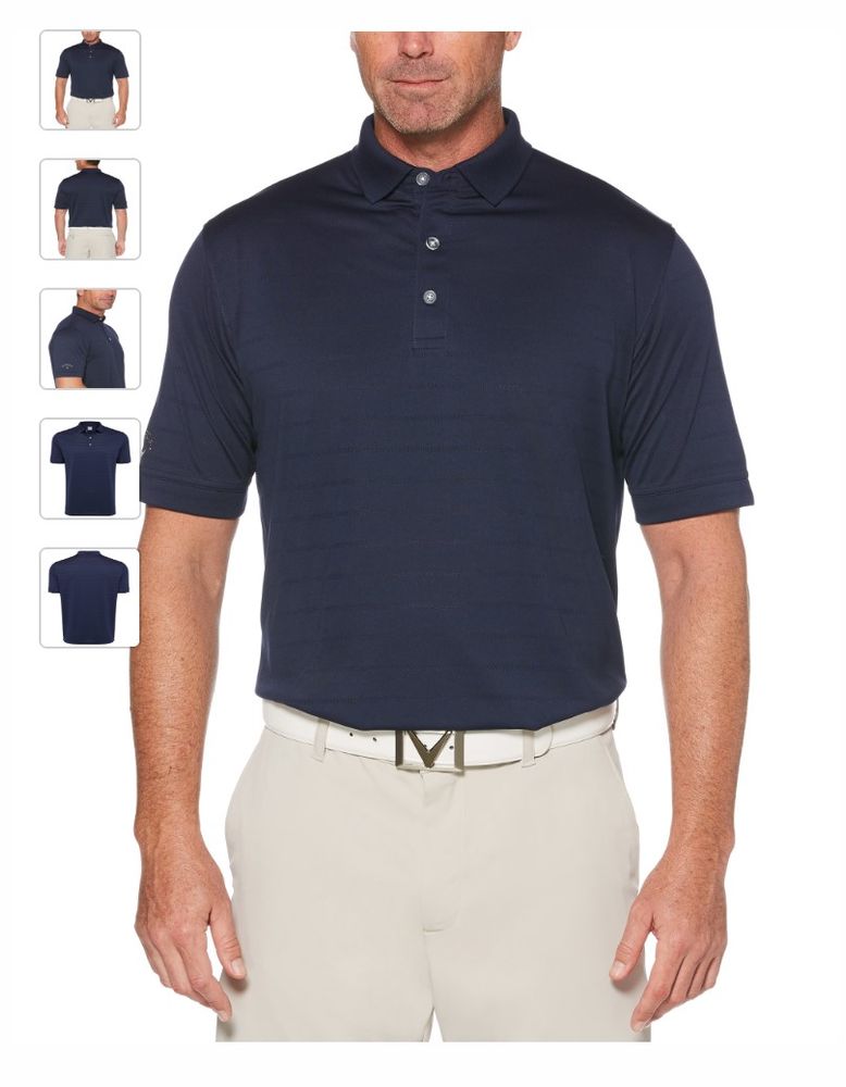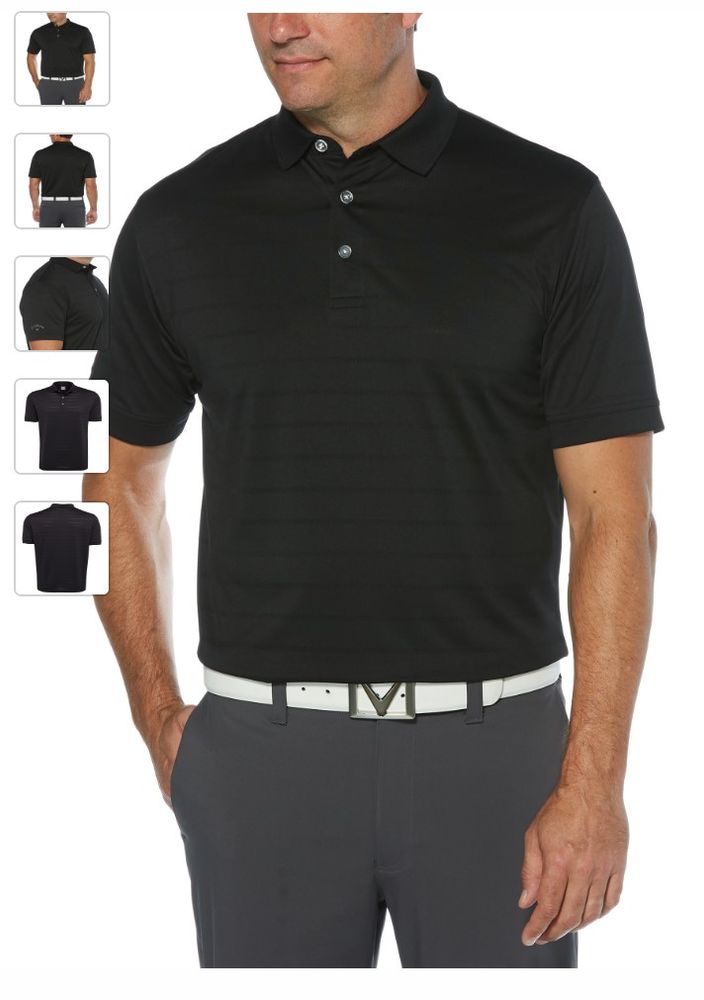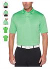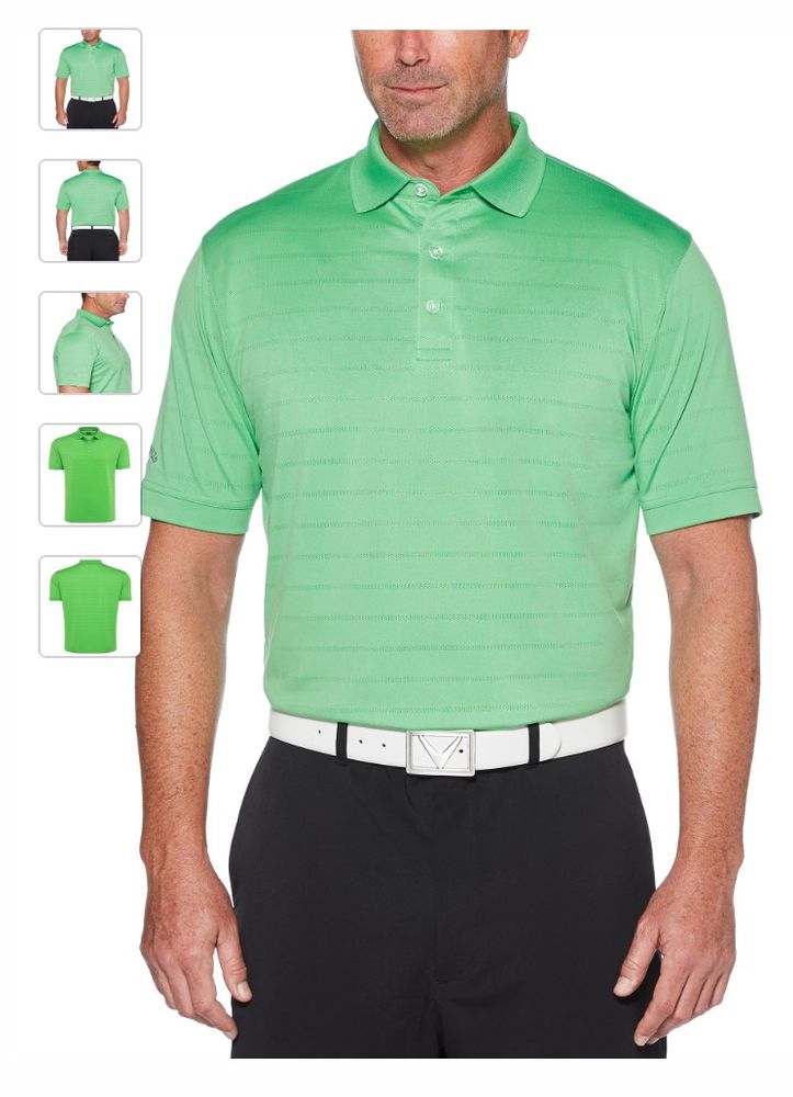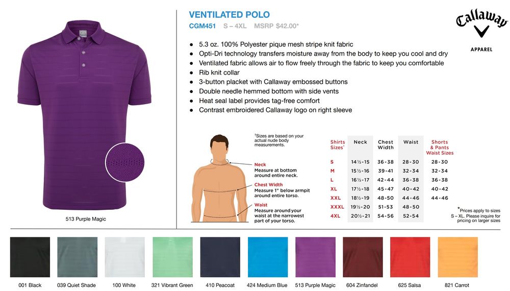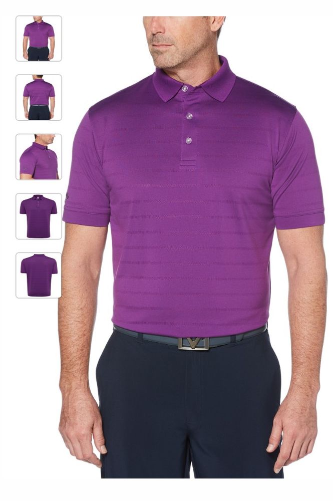 Genuine Callaway Opti-Vent Polo. 5.3 oz 100% polyester pique mesh stripe knit fabric. Opti-Dri technology transfers moisture away from the body to keep you cool and dry. Ventilated fabric allows air to flow freely through the fabric to keep you comfortable. Rib knit collar. 3-button placket with Callaway embossed buttons. Double needle hemmed bottom with side vents. Heat seal label provides tag-free comfort. Contrast embroidered Callaway logo on right sleeve.