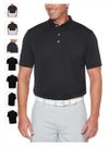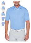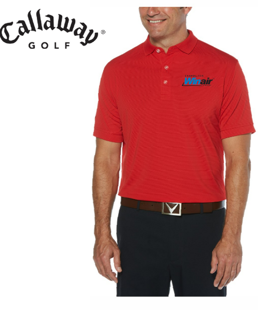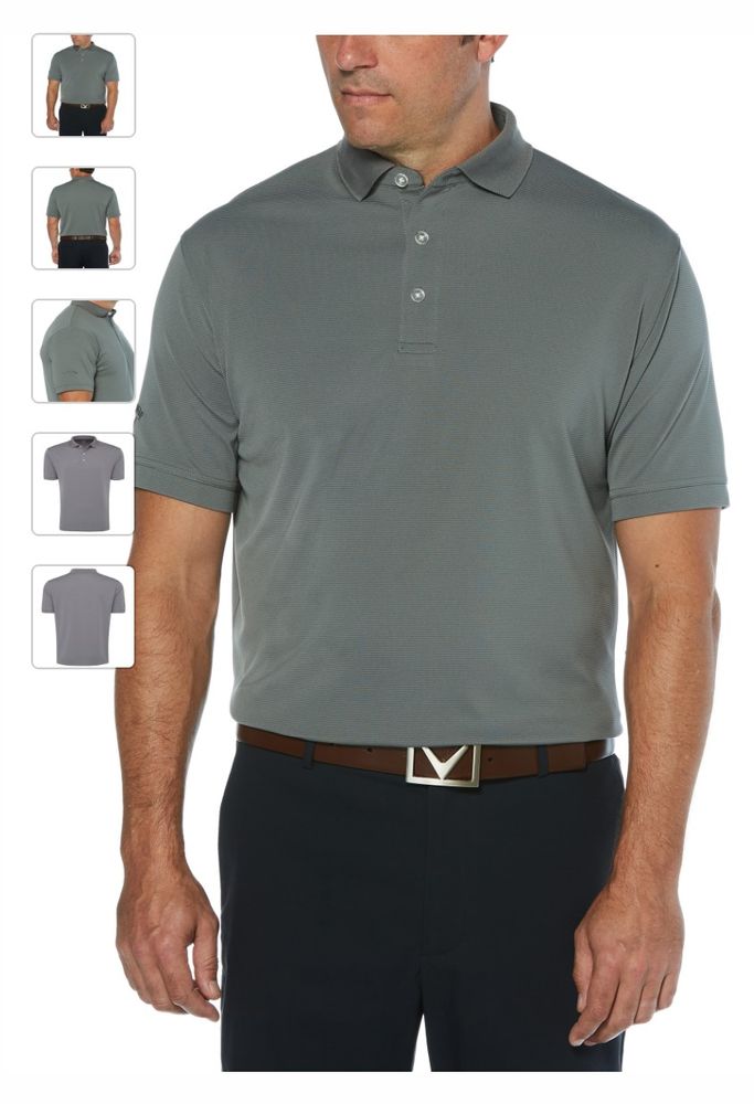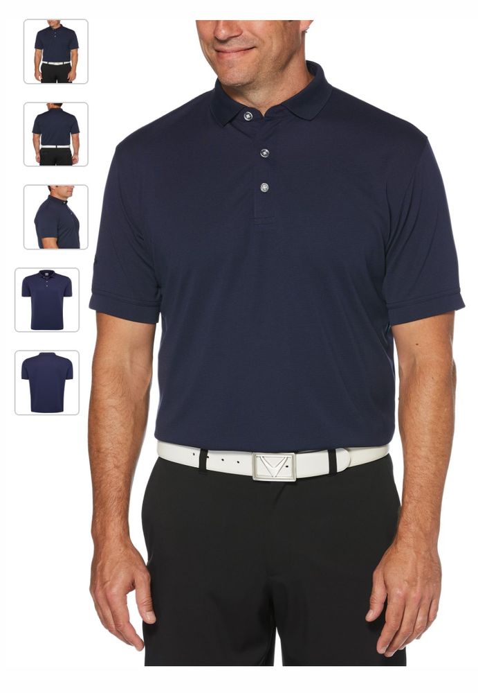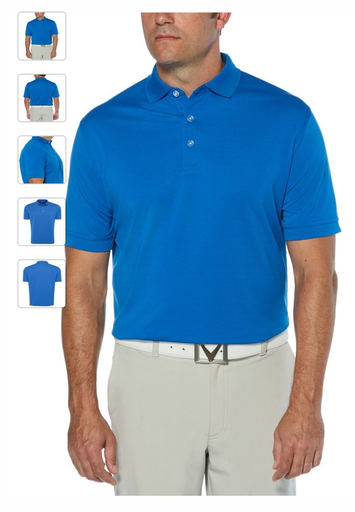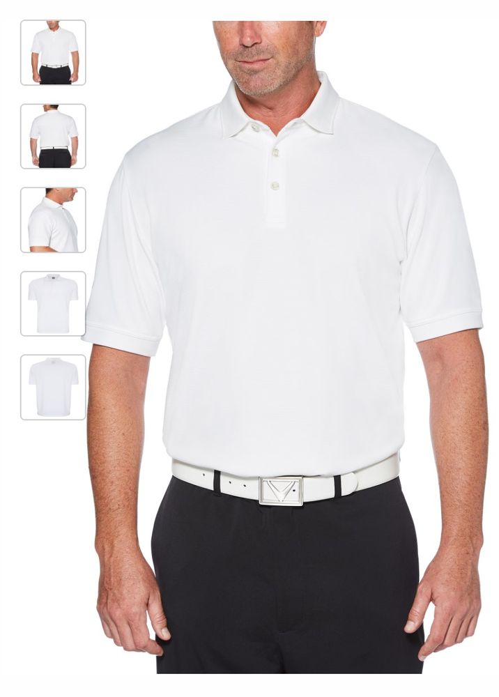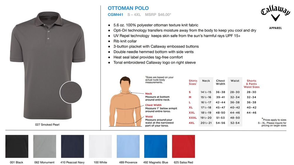 Geniune Callaway Ottoman Polo. 5.6 oz 100% polyester ottoman texture knit fabric. Opti-Dri technology transfers moisture away from the body to keep you cool and dry. UV Repel technology keeps skin safe from the sun's harmful rays. UPF 15+. Rib knit collar. 3-button placket with Callaway embossed buttons. Double needle hemmed bottom with side vents. Heat seal label provides tag-free comfort. Tonal embroidered Callaway logo on right sleeve.