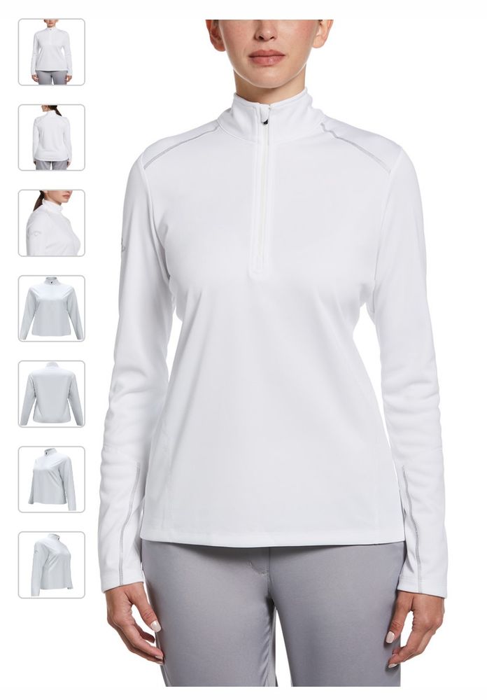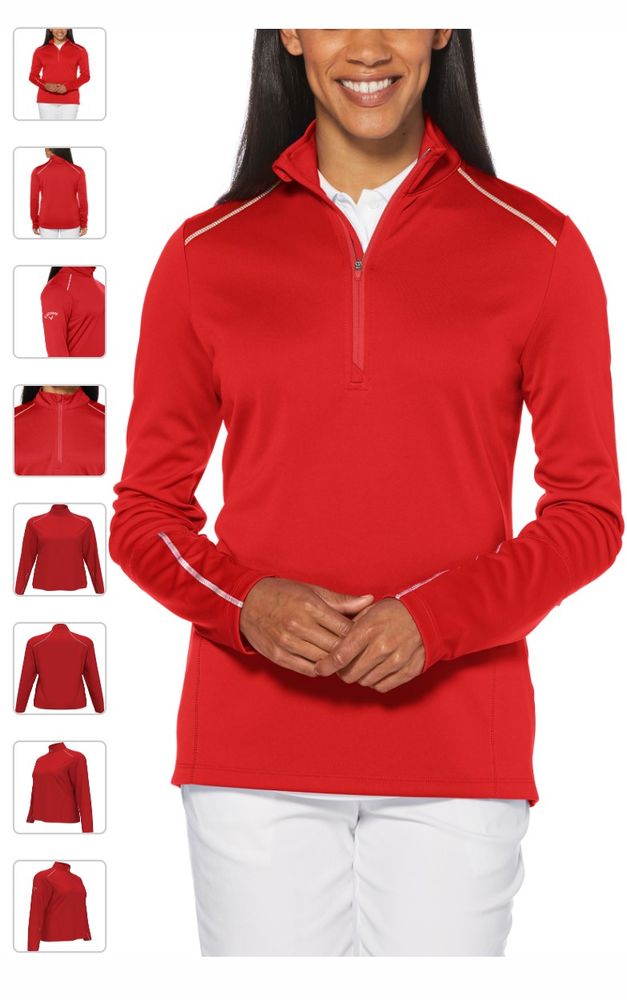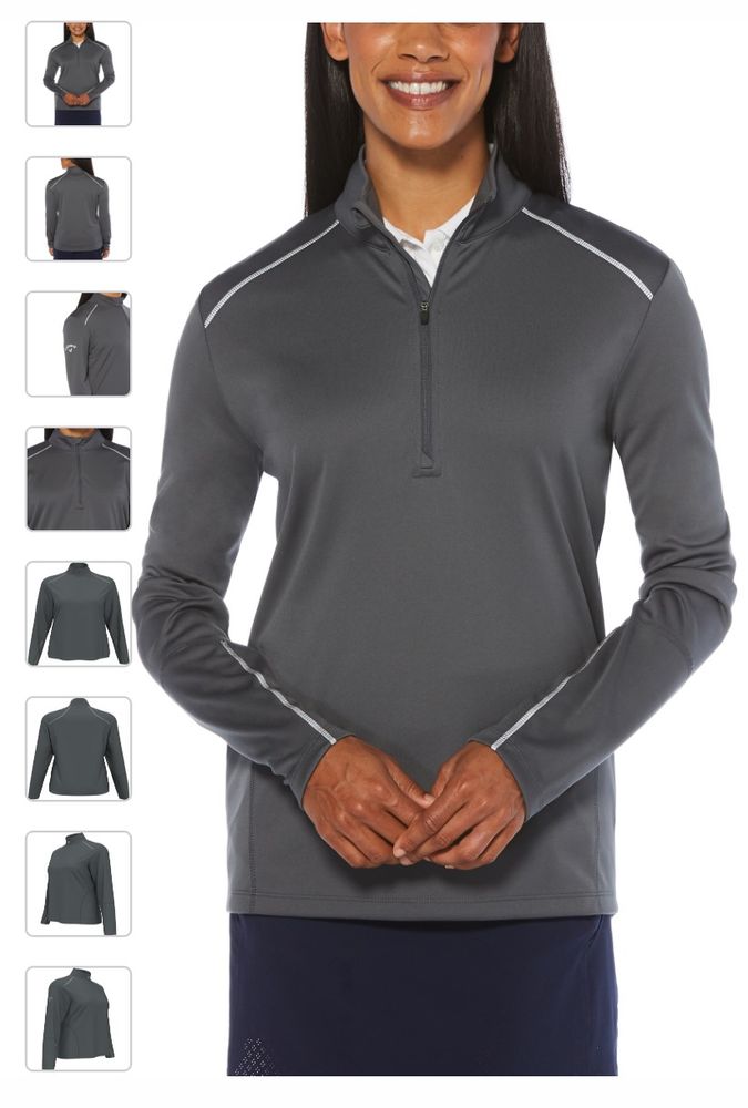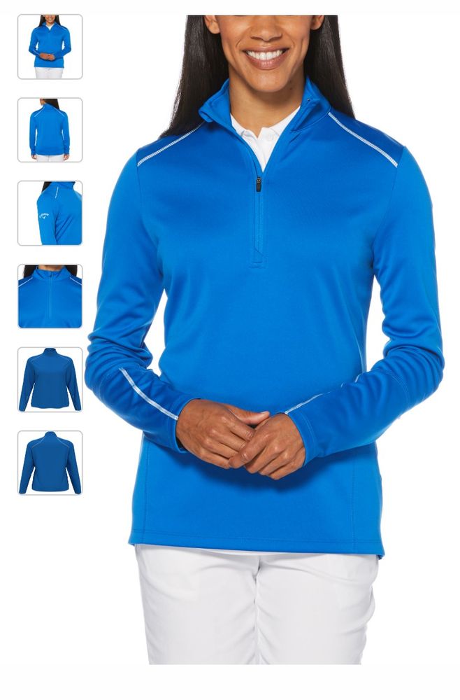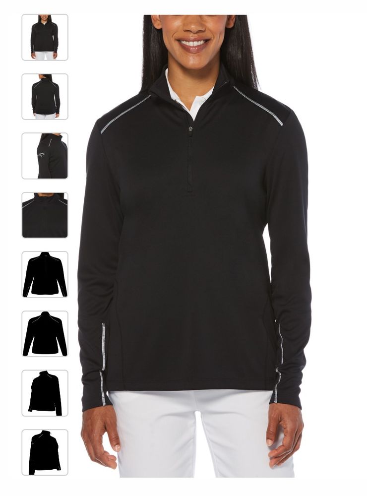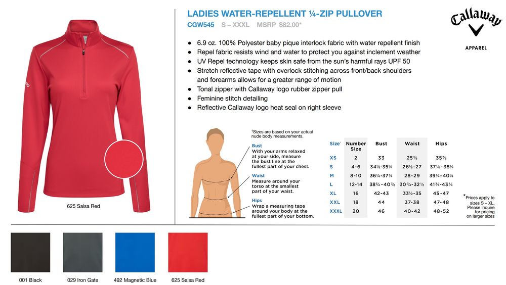 Genuine Ladies Callaway Water Repellent 1/4 Zip Pullover. 6.9 oz 100% polyester baby pique interlock fabric with water repellent finish. Repel fabric resists wind and water to protect you against inclement weather. UV Repel technology keeps skin safe from the sun's harmful rays. UPF 50. Stretch reflective tape with overlock stitching across front/back shoulders and forearms allows for a greater range of motion. Tonal zipper with Callaway logo rubber zipper pull. Feminine stitch detailing. Reflective Callaway logo heat seal on right sleeve.