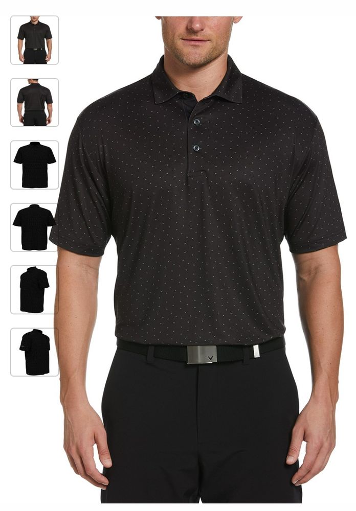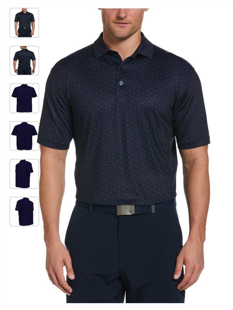 Geniune Callaway Micro Chev Print Polo. 5.8 oz 95% polyester, 5% spandex jersey knit fabric. Opti-Dri technology transfers moisture away from the body to keep you cool and dry. UV Block technology keeps skin safe from the sun's harmful rays. UPF 50+Self fabric collar. 3-button placket with Callaway embossed buttons. Double needle hemmed bottom with side vents. Heat seal label provides tag-free comfort Contrast heat seal Callaway logo on right sleeve.