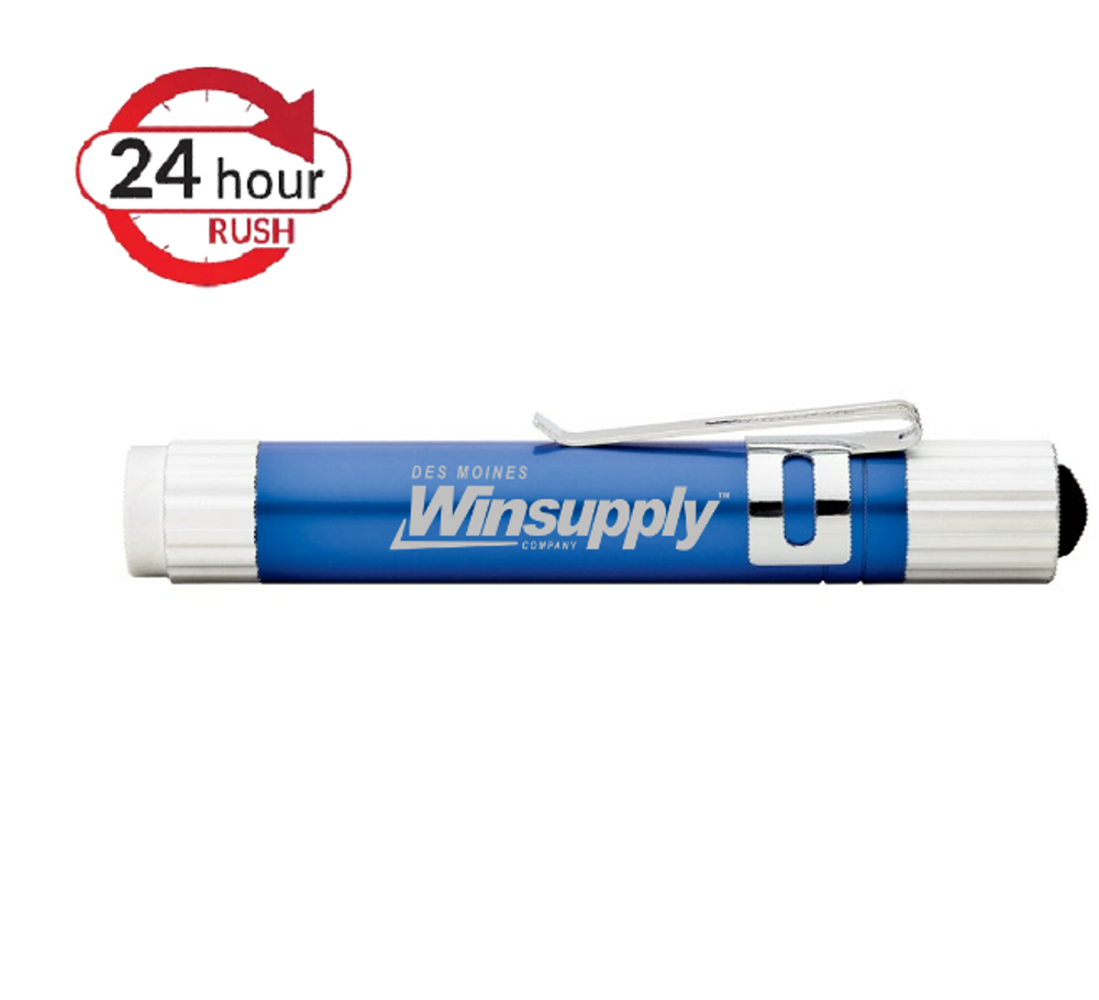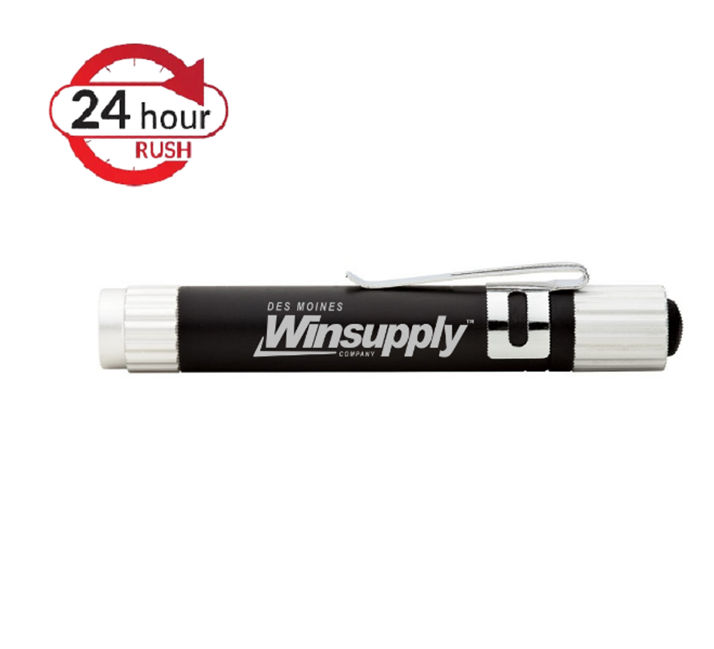 Aluminum LED 17 Lumen flashlight with pocket clip. Rubber on/off button. 3 AG13 / LR44 Batteries Included.