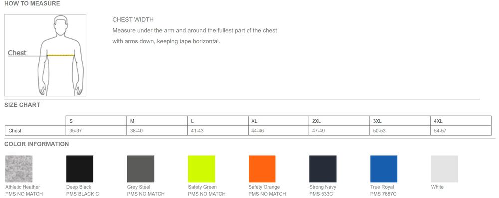 • 50/50 cotton/poly (Safety Green, Safety Orange)
