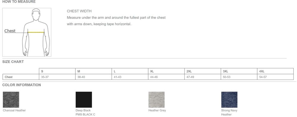 • 50/50 cotton/poly (Charcoal Heather, Strong Navy Heather)