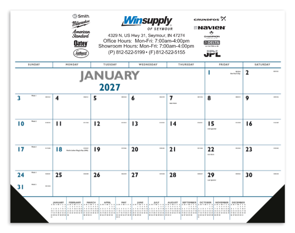 This desk pad will keep your location name right under the nose of current and potential customers on a daily basis! Measures 22"W x 17"H and made of 50# offset paper stock. Vinyl corners provide an attractive frame and durability. Grid includes Julian dates.