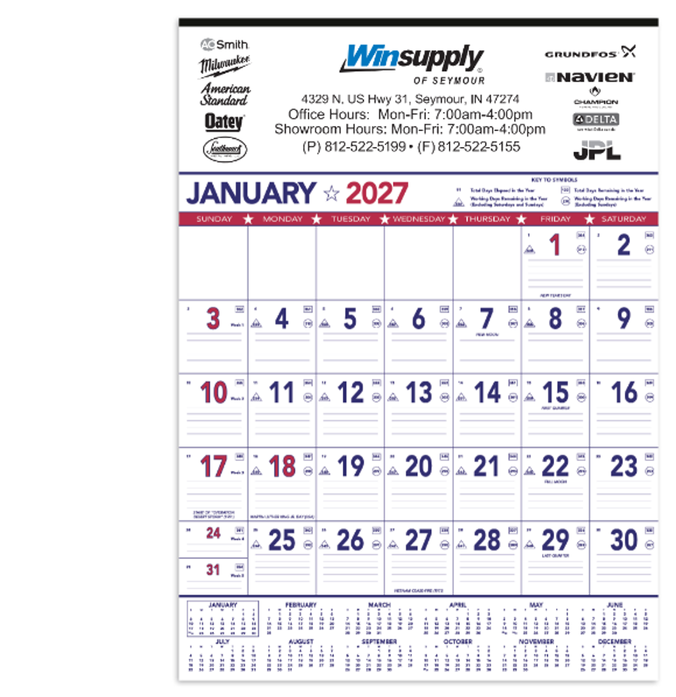 NOTE: We can store and ship your order in November at no extra charge. Calendars are shipped flat bulk for hand and/or counter distribution. For easy mailing, specify factory to pre-insert your calendars into tubes, mailers or pull-string wrappers for small extra charge.