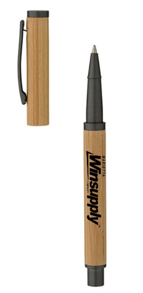 The Hana ballpoint is a cap-off style pen made from eco-conscious sustainable bamboo. It features a smooth bamboo body and gunmetal colored clip and trim and the removable cap fits on the back end of the pen while in use.