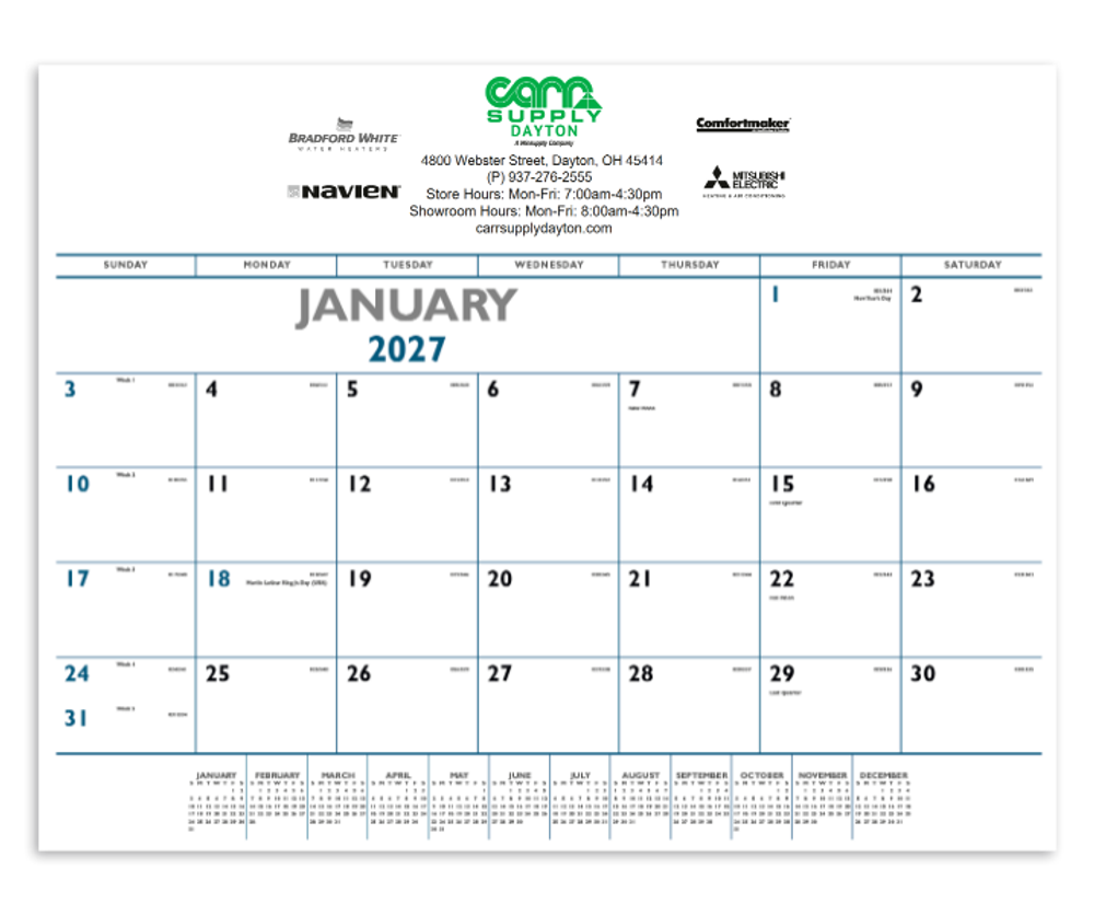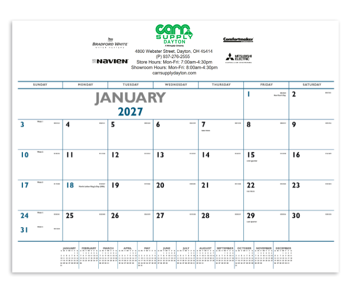 NOTE: We can store and ship your order in November at no extra charge. Calendars are shipped flat bulk for hand and/or counter distribution. For easy mailing, specify factory to pre-insert your calendars into tubes, mailers or pull-string wrappers for small extra charge.