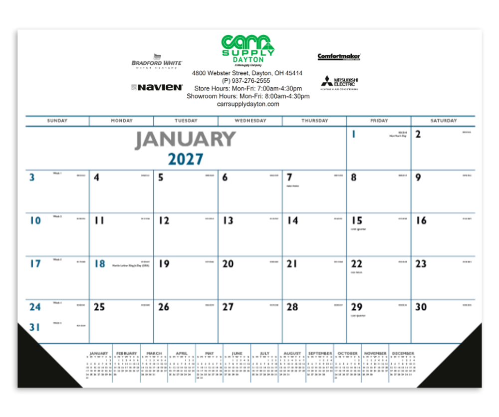 This desk pad will keep your location name right under the nose of current and potential customers on a daily basis! Measures 22"W x 17"H and made of 50# offset paper stock. Vinyl corners provide an attractive frame and durability. Grid includes Julian dates.