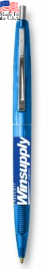 Made in the USA! Genuine BIC Translucent Clic Stic Pen. Polished nickel-plated trim and black ink in pen. Made of 26% plastic from a renewable resource and is refillable.