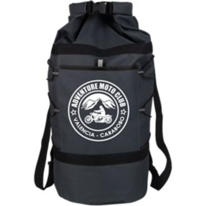 Adventure Duffel Bag is made of water-resistant material. Stylish roll-down top and clip so you can carry three ways: by the clip, as a duffle, as a backpack. Makes a great 'Thank You' counter bag for large orders or as a Holiday Gift holder.