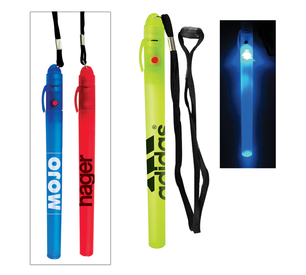 Light up stick on layard with 3 light settings; flashing, strobe and solid. On/off button. Battery included. Actual size is 6-3/4"h x 1/2"w. Individually polybagged. Some assembly required. Pricing includes 1-color logo ONLY.