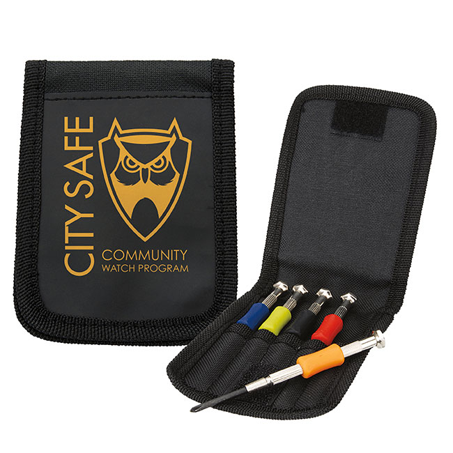 With five mini screwdrivers, this colorful, fun set is a must have for any home or office. The small tools are ideal for opening battery compartments, or working on small electronics. Features: Colored handles for easy identification. Convenient, stylish case keeps tools together. Material: Pouch: 600D polyester, Closure patch: polyurathane vinyl, Screwdrivers: carbon steel with silicone handles. Product Includes: 3 screwdrivers (Phillips), 2 screwdrivers (slotted) Product Size: 3-1/4"w x 4-1/2"h x 1/2"d. Pricing includes 1-color logo ONLY on pouch.