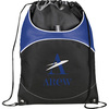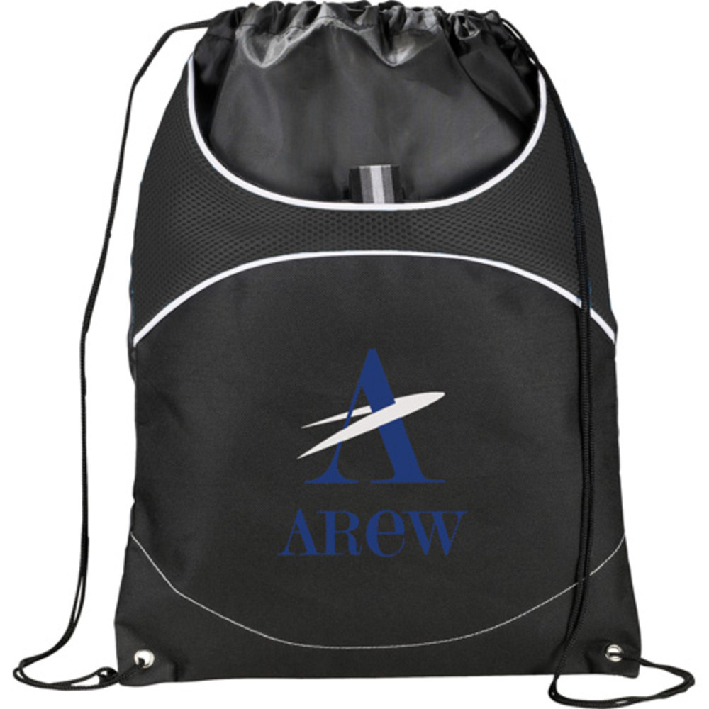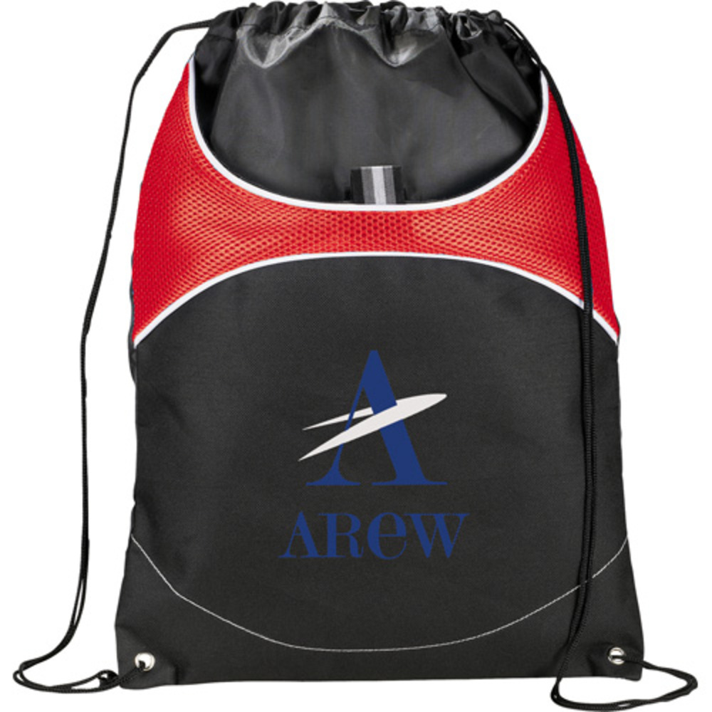 Open main compartment with cinch top. Drawstring design for shoulder or backpack carry. Features a large front Velcro pocket with mesh top.