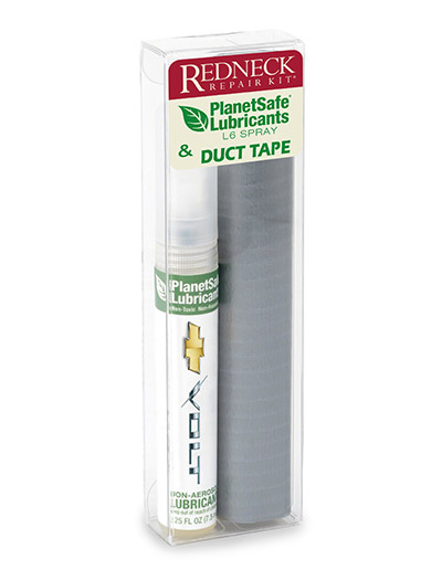 PlanetSafe and duct tape come together in the kit that can fix anything! Sure to bring a smile, the Redneck Repair Kit® features the PlanetSafe® L6 Lubricant Spray and a Duct Tape sheet.