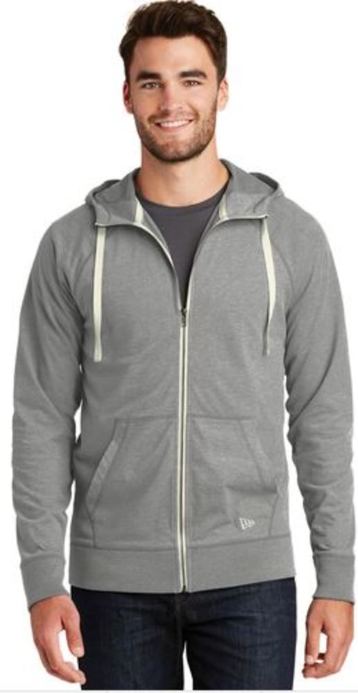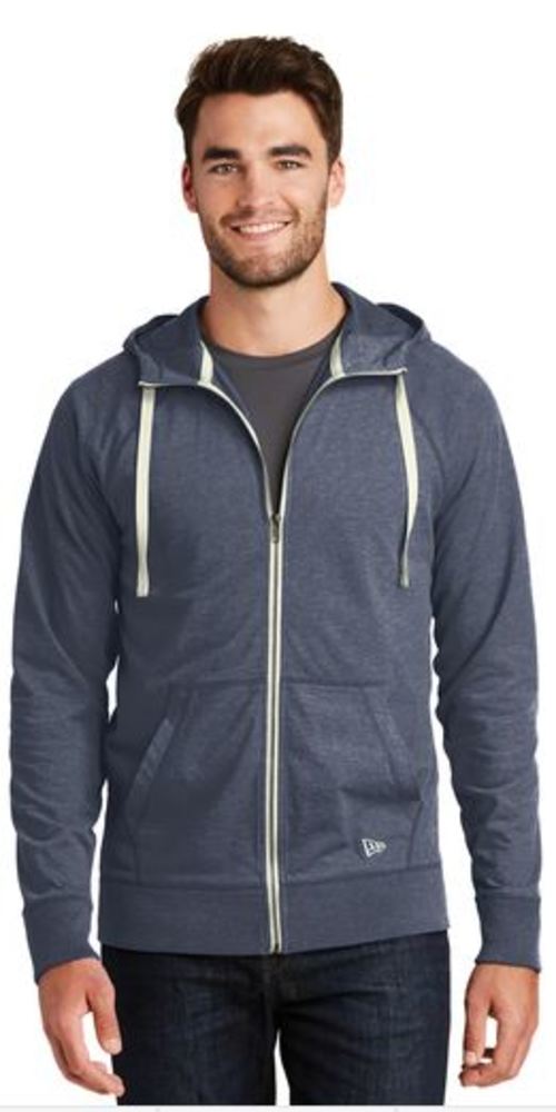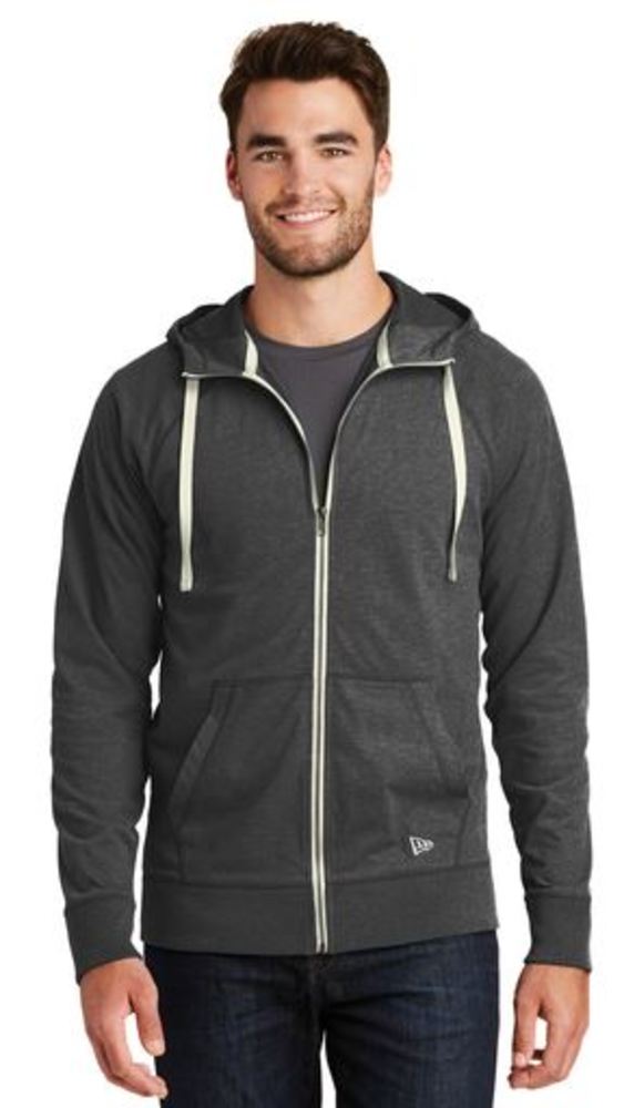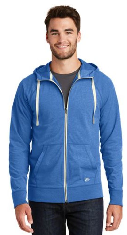 This lightweight hoodie has lived-in sueded softness and vintage appeal. 5-ounce 60/40 sueded ring spun cotton/poly jersey knit. 20 singles. 3-panel hood. Zip-through collar. Heat transfer label for tag-free comfort. Contrast drawcords (except White). Contrast metal zipper. Front pouch pocket.s Embroidered New Era flag logo on left pocket. Rib knit cuffs and hem.