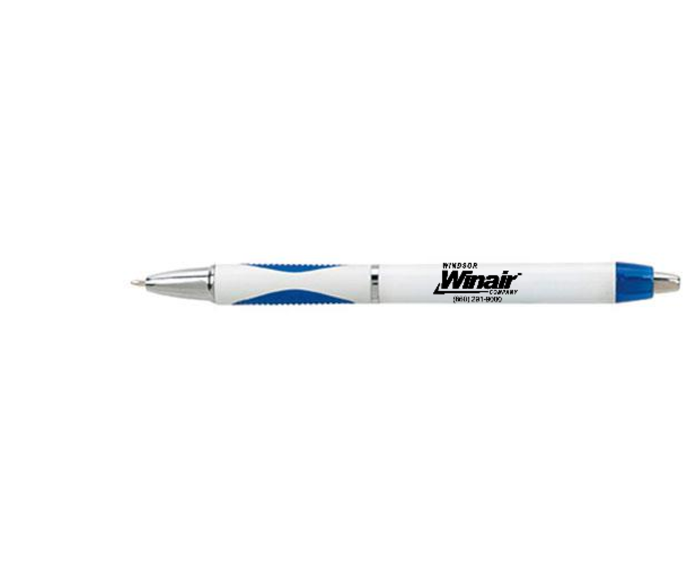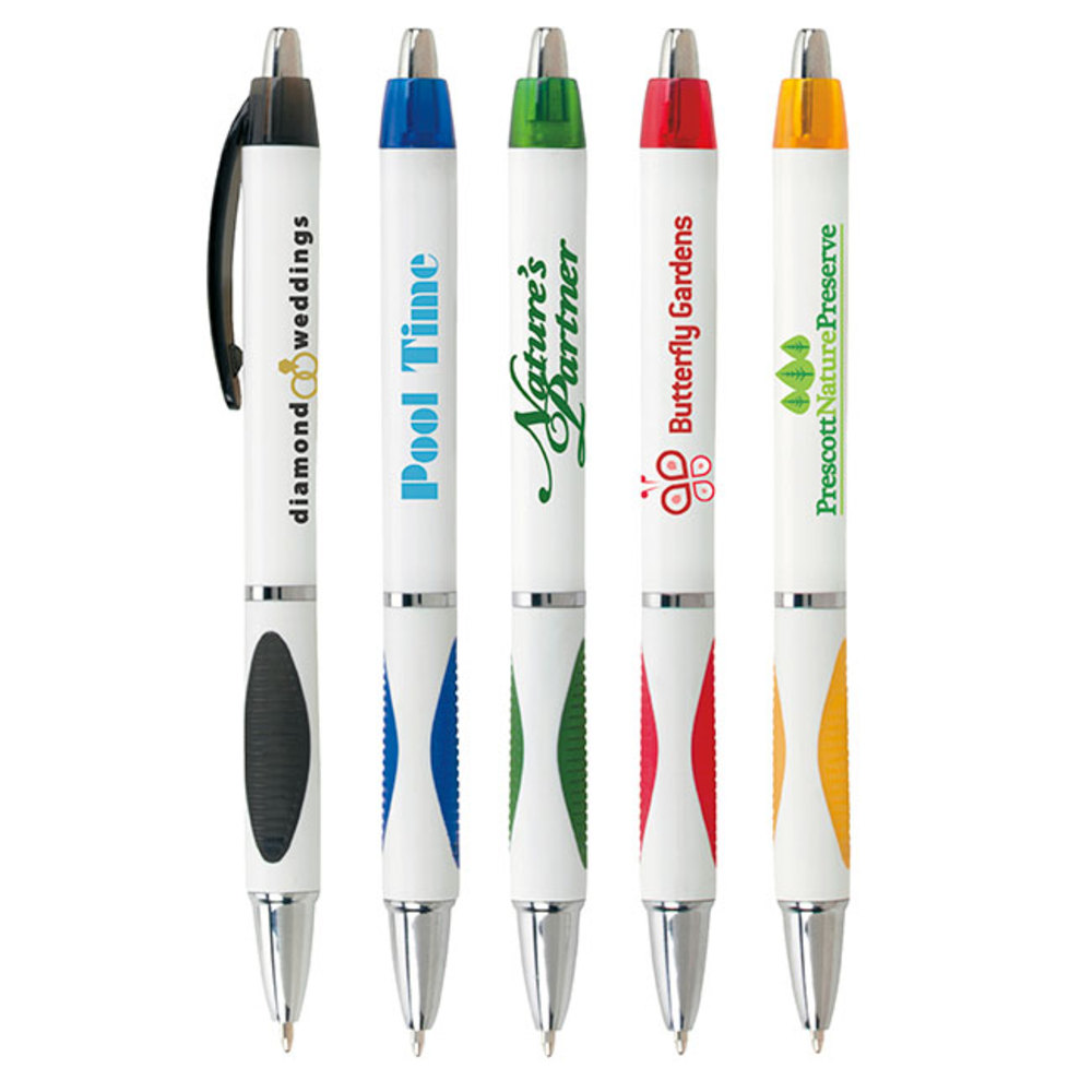 Sleek chrome accents and a "spot" of colorful rubber grip on each side of the barrel make the Spot look great with any company logo. Writes black ink with medium point.