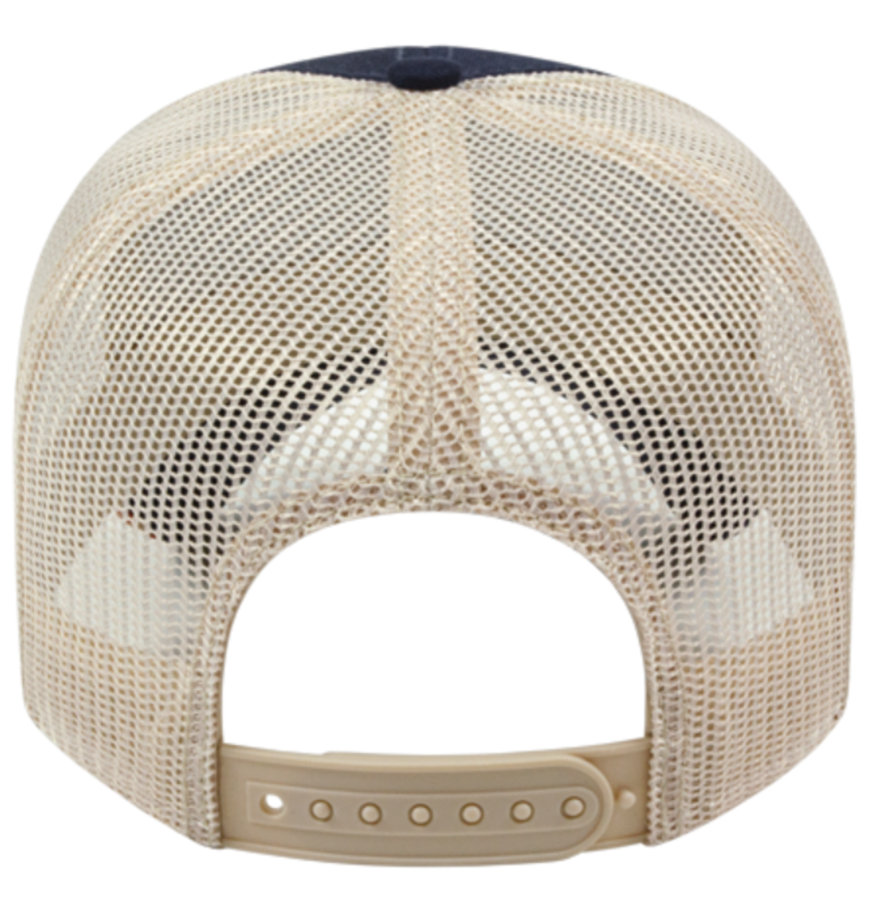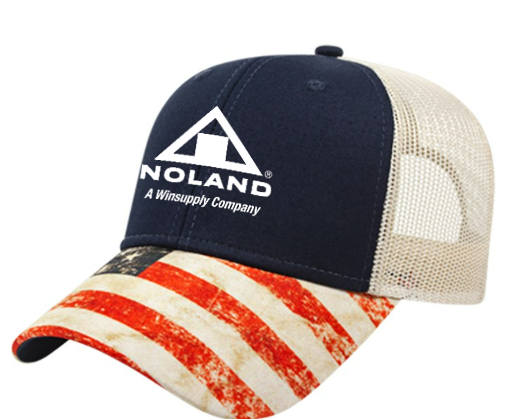 This is a medium-profile six panel structured cap. It is made of chino twill with trucker mesh. Sublimated American flag on 100% polyester visor and adjustable plastic snap tab closure.