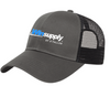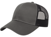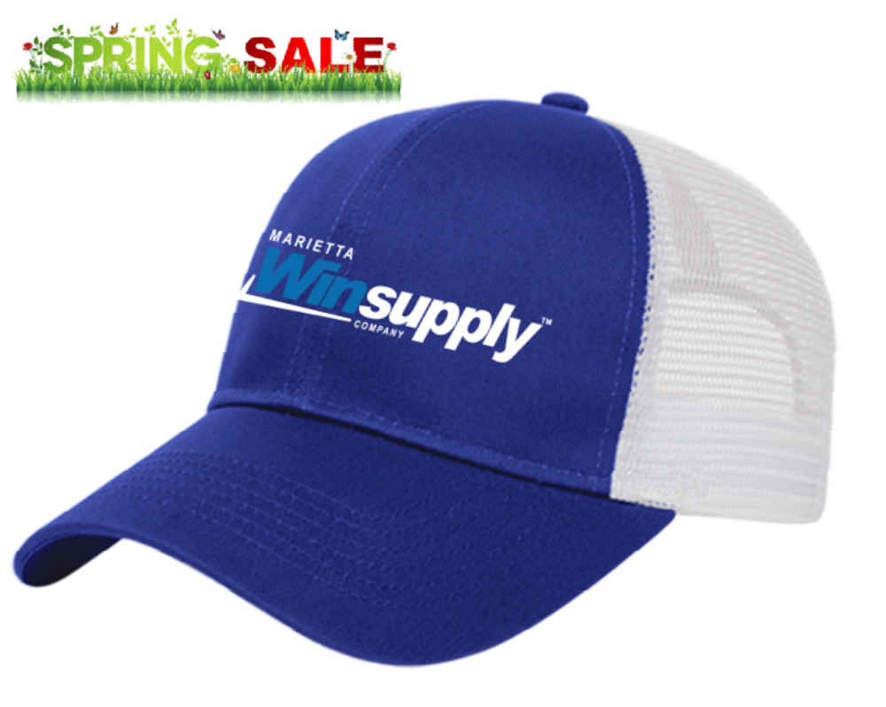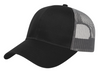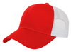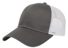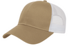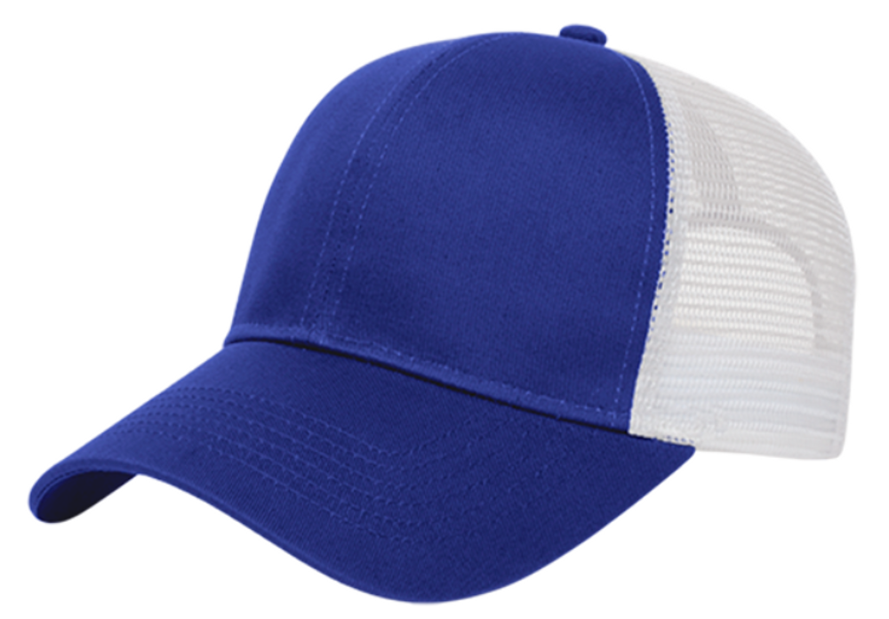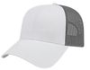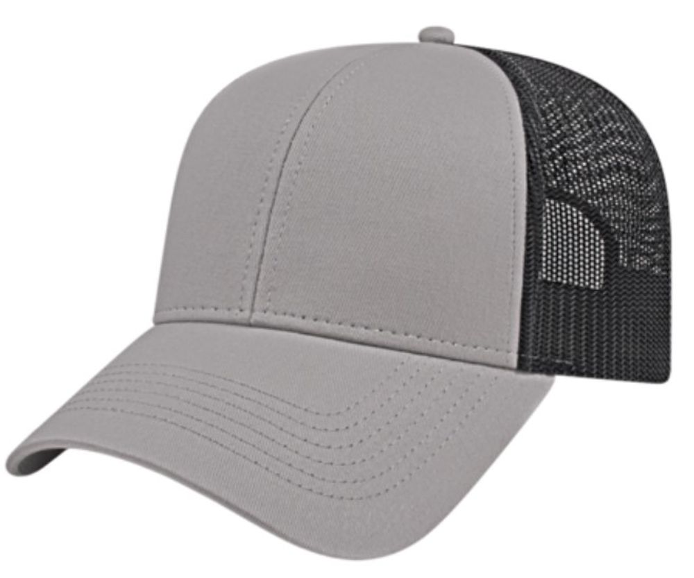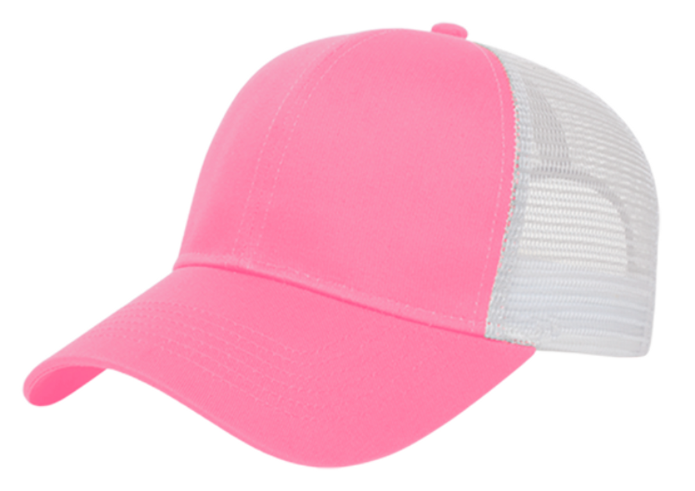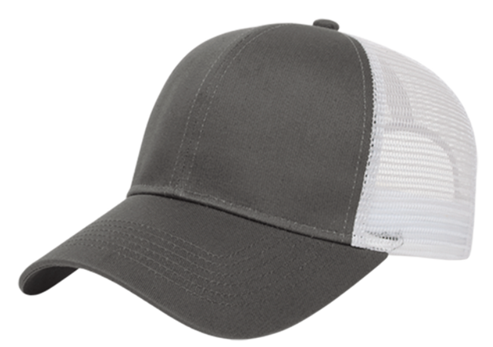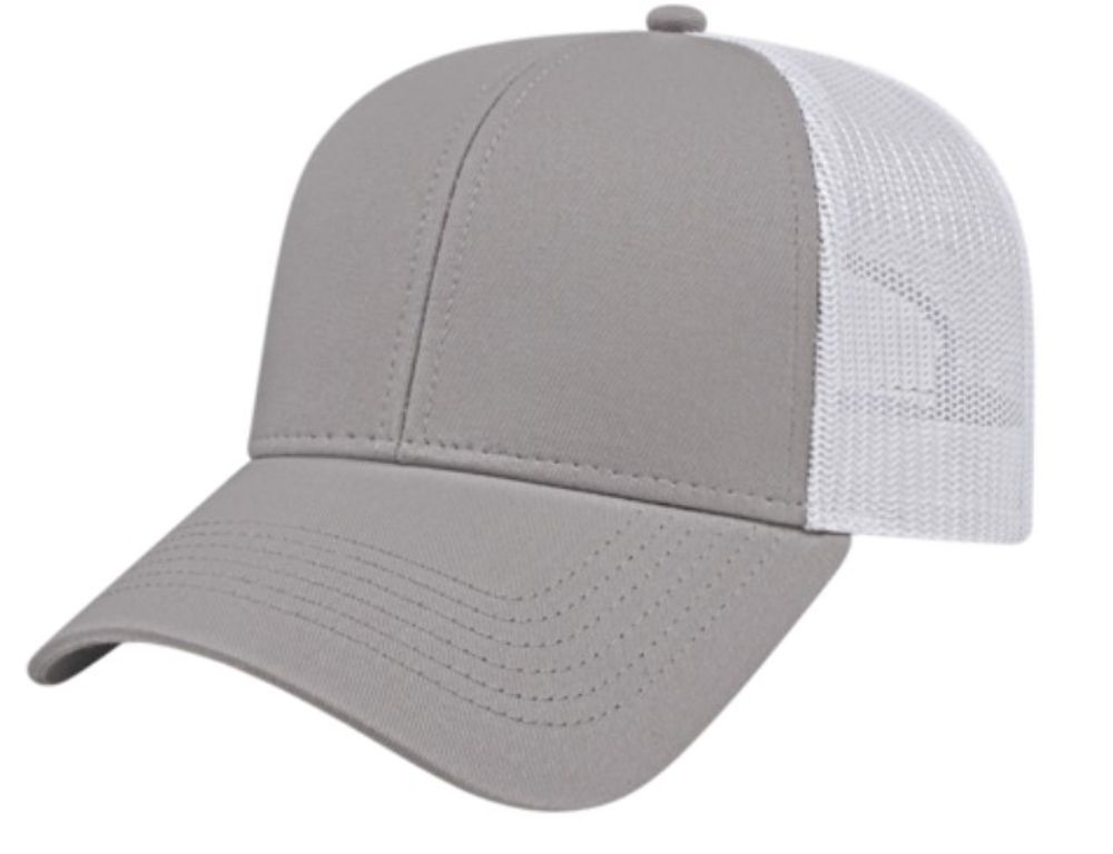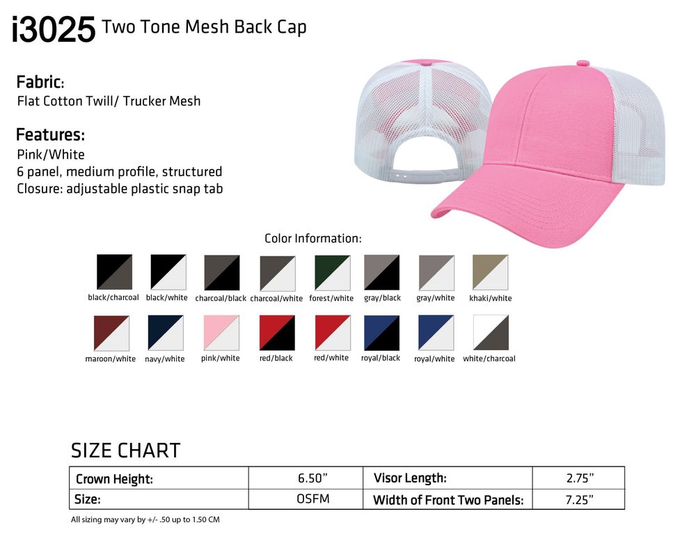 This is a medium profile 6-panel structured cap. It is made of 6 oz. cotton twill fabric with white mesh back and an adjustable white plastic snap tab.