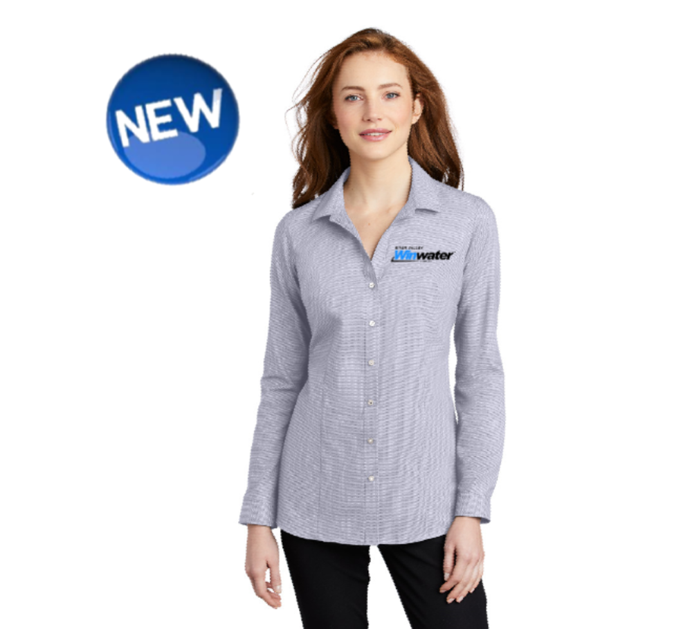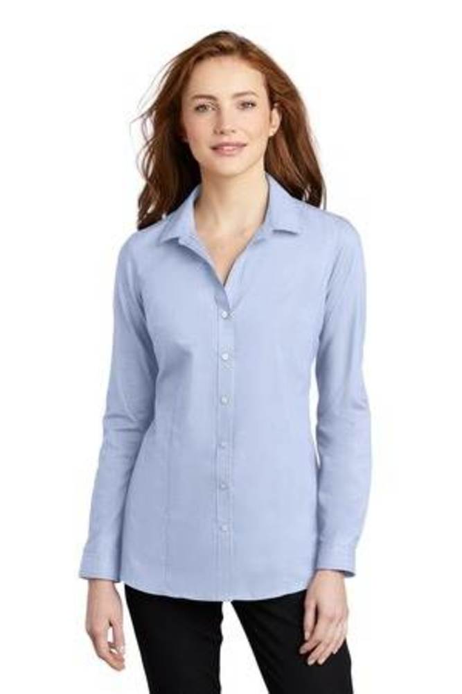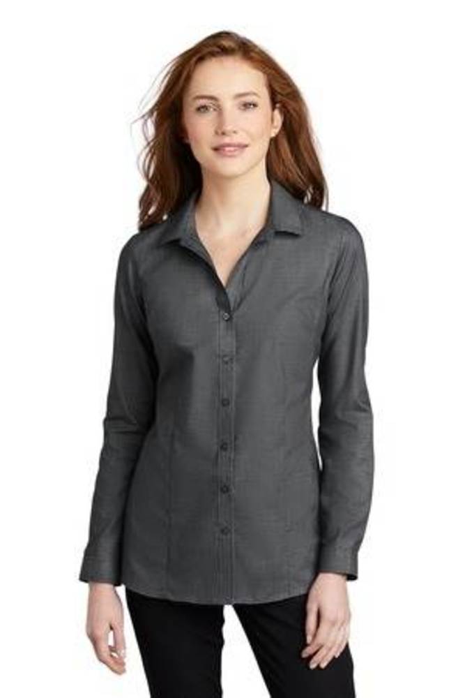 A subtle pincheck pattern offers understated texture in these wrinkle-resistant shirts. Eye-catching and easy-to-wear, they have a refreshing and refined corporate look. Made of 3.4-ounce, 60/40 cotton/poly with open collar and neckline and pearlized buttons. Slightly longer length with bust darts, front and back seaming, and mitered adjustable cuffs.