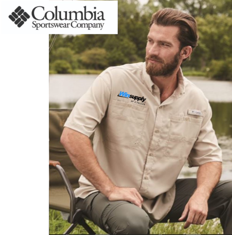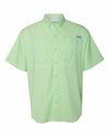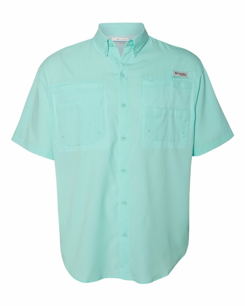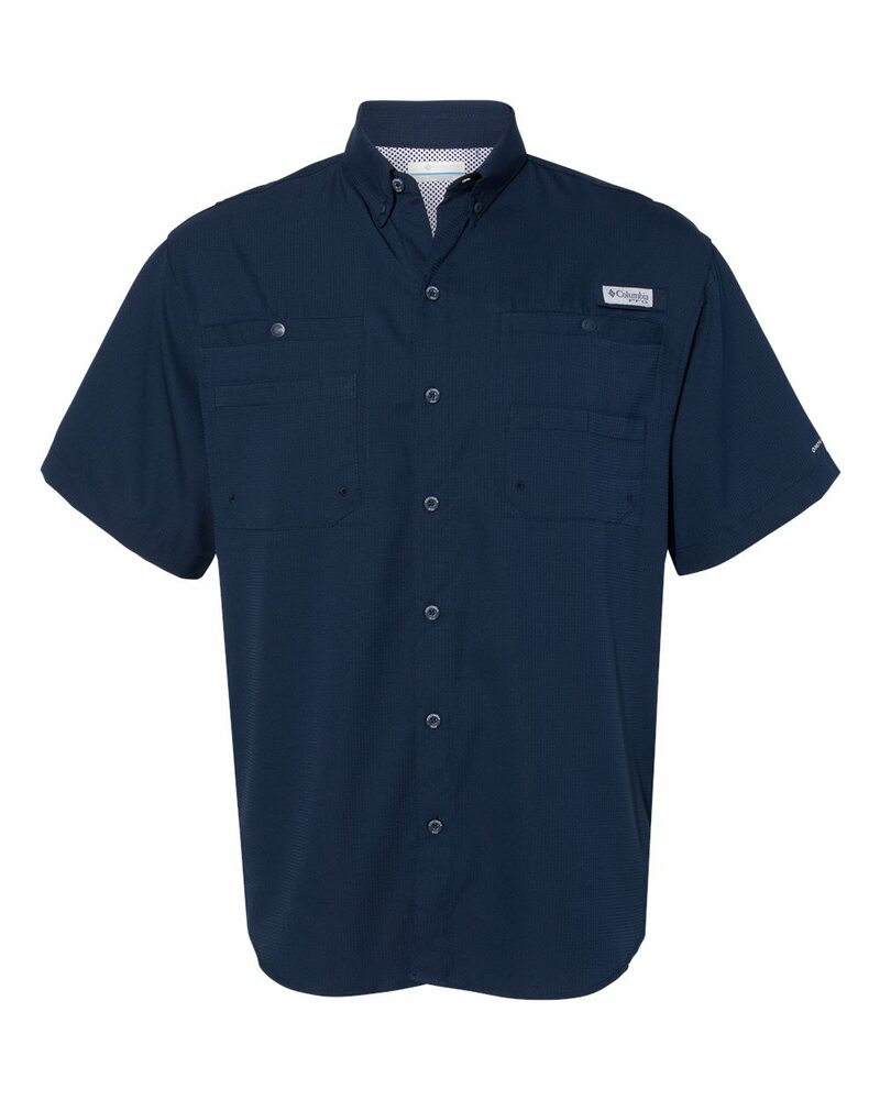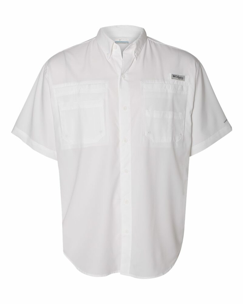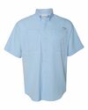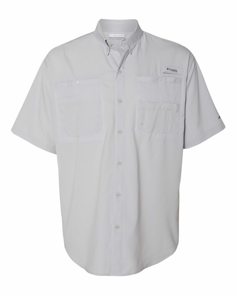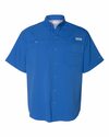 Genuine Columbia Performance Fishing Gear (PFG) 100% polyester ripstop short-sleeve shirt. Features Omni-Shade™ UPF 40 protection and Omni-Wick™ moisture-management properties. Hook-and-loop rod holder with Columbia logo on left chest. Mesh-lined vent at center back. Chest pockets with snap closure'