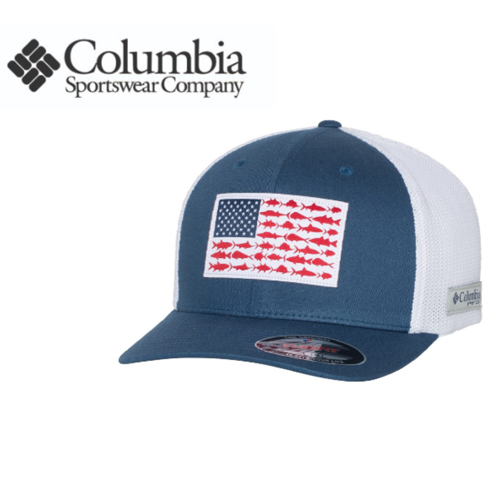 Genuine Columbia PFG Fish Flag Mesh™ Flexfit Cap. Made of 55/43/2 polyester/cotton/spandex. Structured, six-panel, mid-profile. FlexFit® technology. Omni-Shade™ UPF 50 protection. Columbia patch logo on right side of cap.