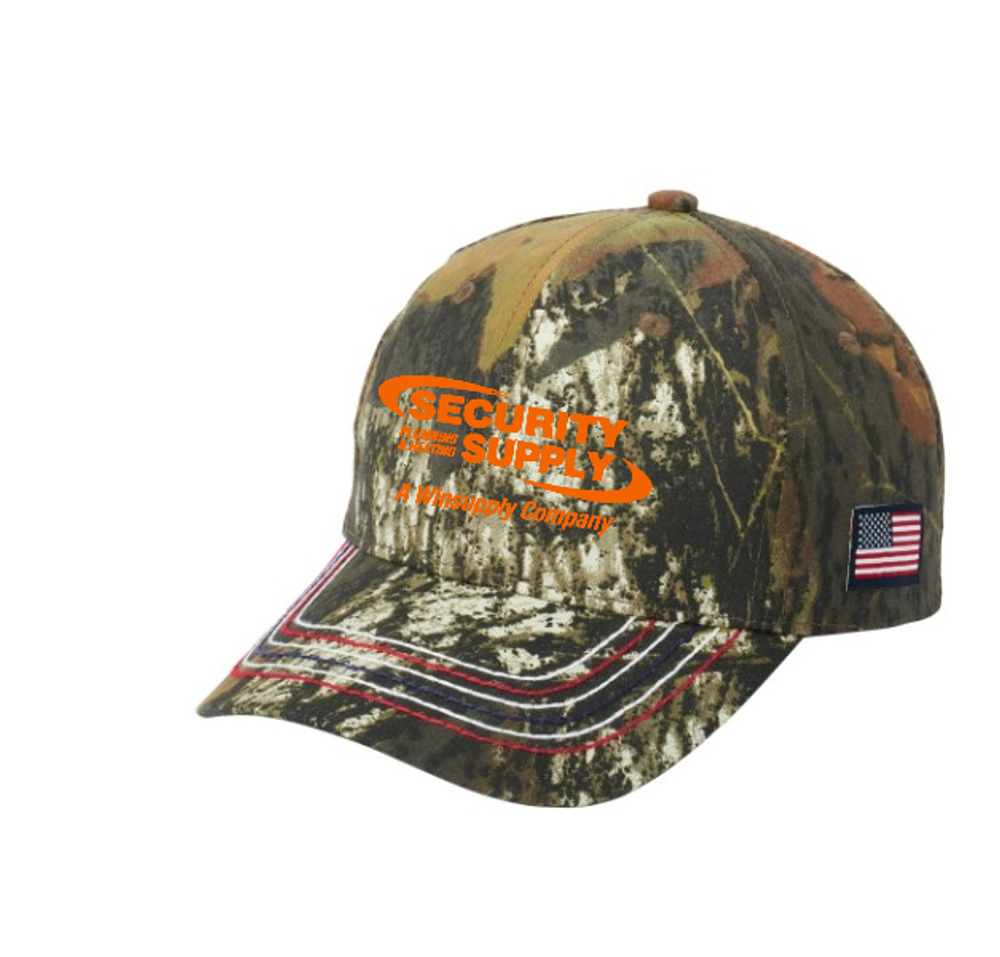 An embroidered flag label on the side plus heavy contrast stitching on the bill make this camo cap a true American classic.