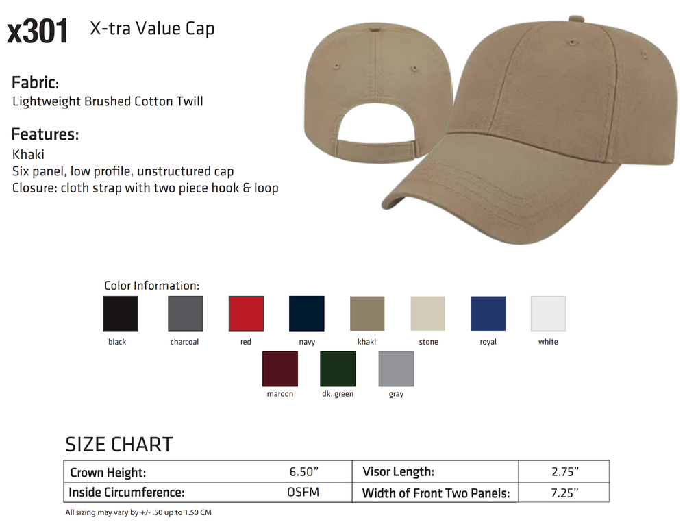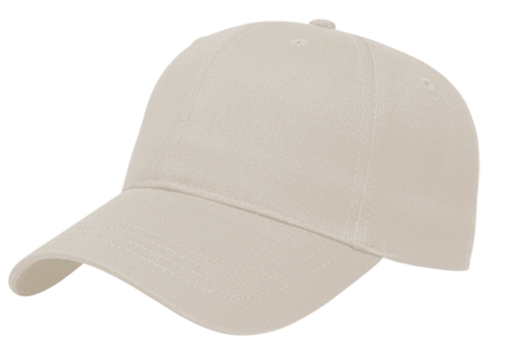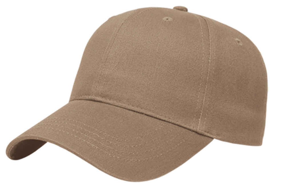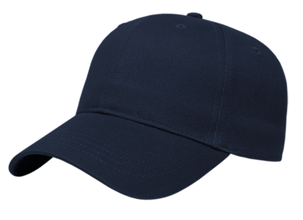 Value low profile six panel unstructured cap. Made of lightweight brushed cotton twill and fabric strap with two-piece hook and loop closure.