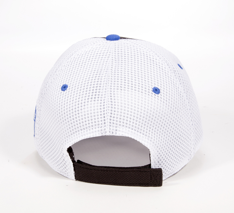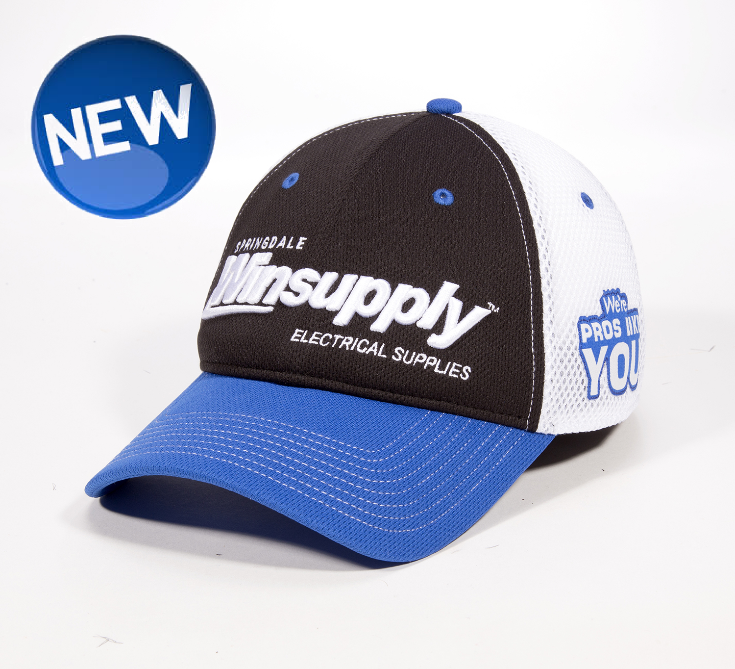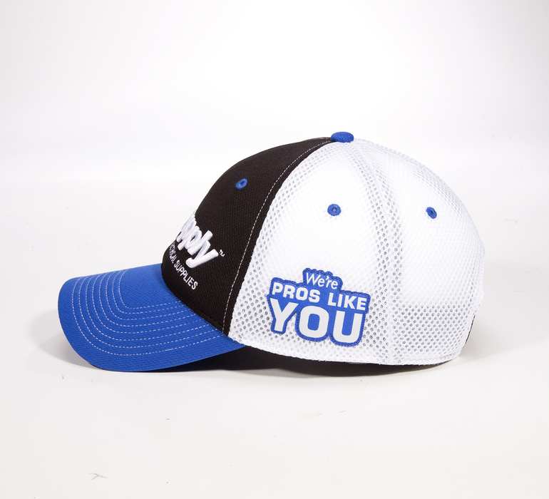 This Special Edition Baseball Cap was created just for Winwholesale! This high-quality, major league style cap features a performance mesh front and sport mesh back with both breathability and moisture wicking properties. Blue with black visor with matching blue eyelets, blue top button, and white visor stitching. Your logo in raised embroidery on full front with 'We're Pros Like You' in special edition patch on side or back of cap. 'Pros Like You' text is also repeated on inside crown taping. Further customize by choosing structured or unstructured front panel, pre-curved, standard, or flat visor, and velcro or metal slider closure.
