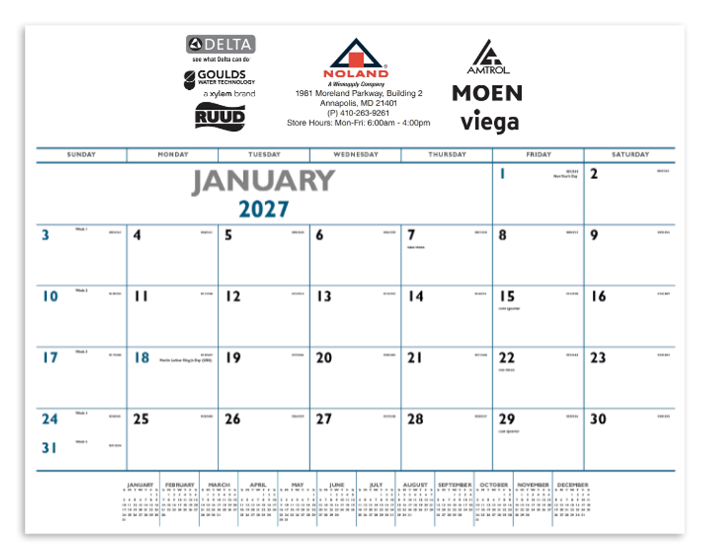 NOTE: We can store and ship your order in November at no extra charge. Calendars are shipped flat bulk for hand and/or counter distribution. For easy mailing, specify factory to pre-insert your calendars into tubes, mailers or pull-string wrappers for small extra charge.