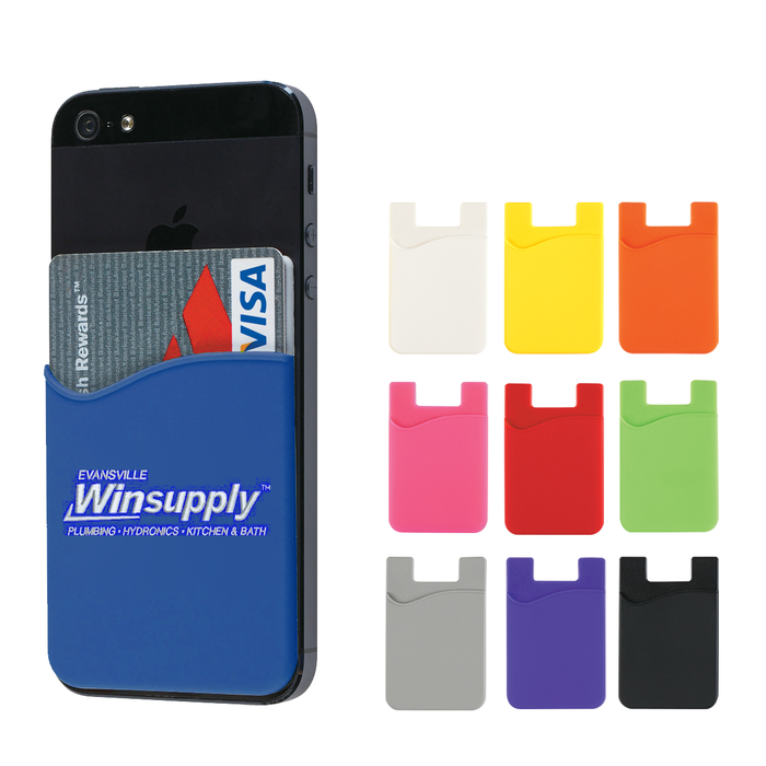 This silicone cell phone wallet adheres to the back of a cell phone with a strong adhesive. It's perfect for carrying identification, room keys, cash or credit cards. Size: 2 ¼" W X 3 ?" H.