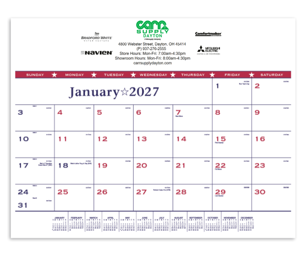 NOTE: We can store and ship your order in November at no extra charge. Calendars are shipped flat bulk for hand and/or counter distribution. For easy mailing, specify factory to pre-insert your calendars into tubes, mailers or pull-string wrappers for small extra charge.